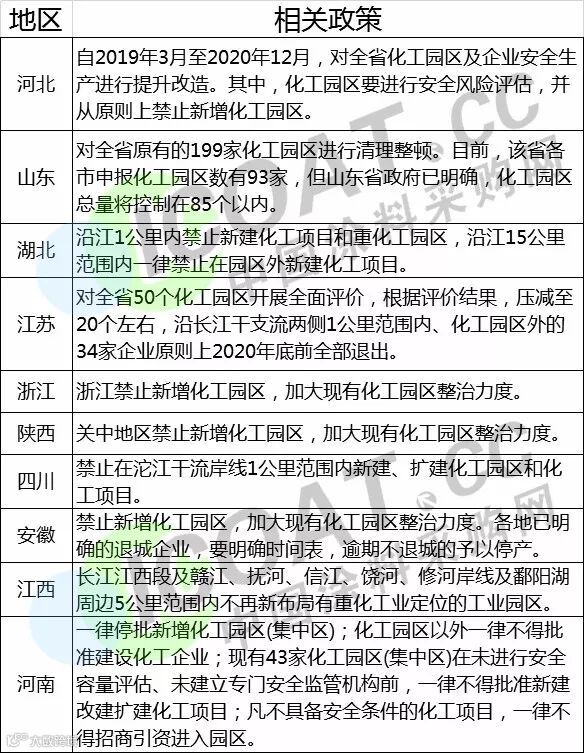 以化工大省山东为例,山东省要求对原有的199家化工园区进行清理整顿。目前山东省申报化工园区数有93家,但山东省政府已明确,化工园区总量将控制在85个以内。据涂料采购网了解,近期山东省陆续公布了四批化工园区和专业化工园区,数量共计85个,这就意味着,山东省的化工园区数量已经到达了总量控制的上限,较之前的199家园区的数量减少了57%。而另一化工大省江苏则在《江苏省化工行业整治提升方案(征求意见稿)》中提出对全省50余个化工园区开展全面评价,根据评价结果,压减至20个左右,压减量高达60%。