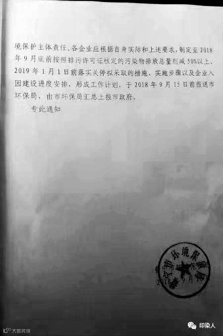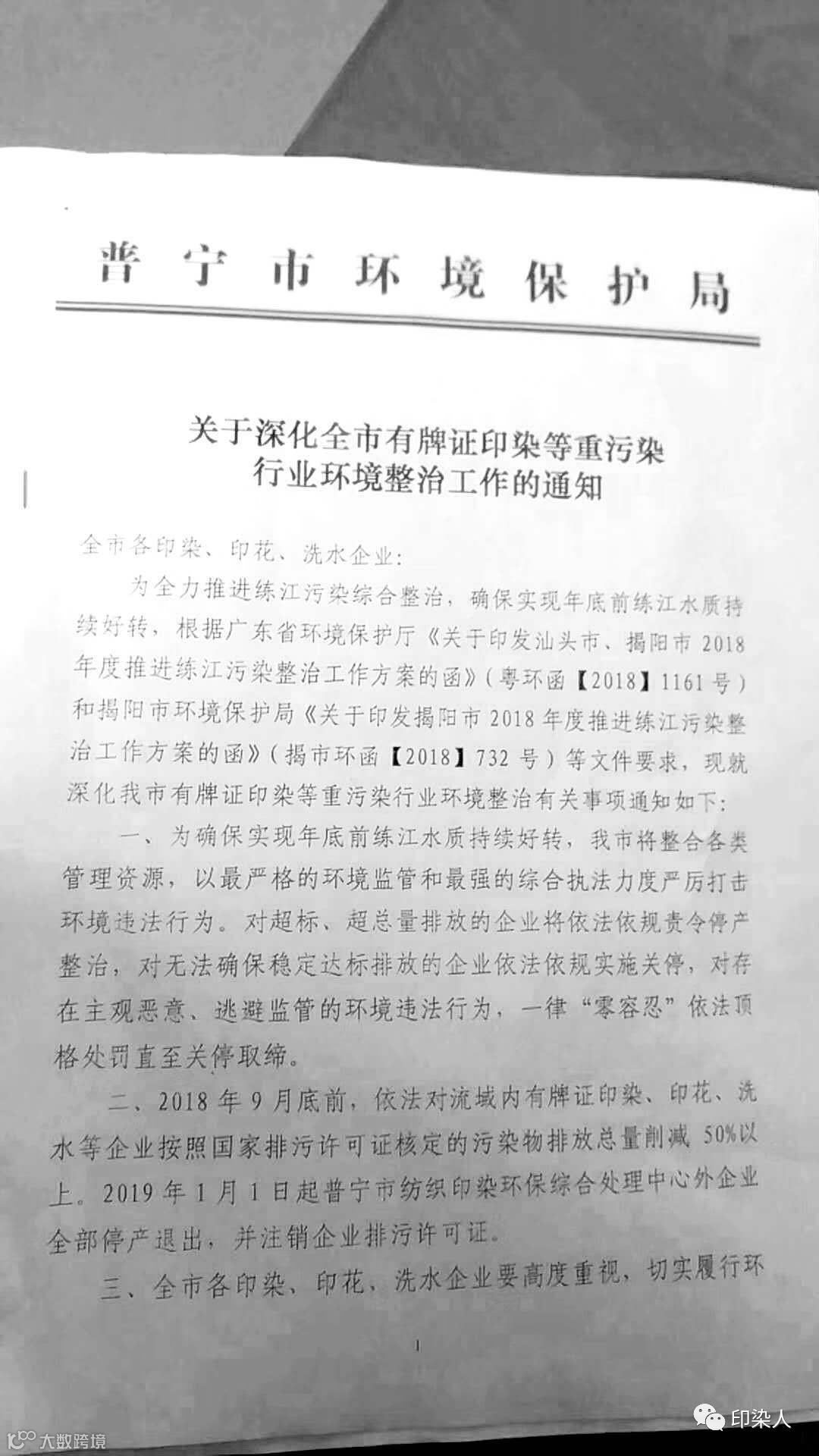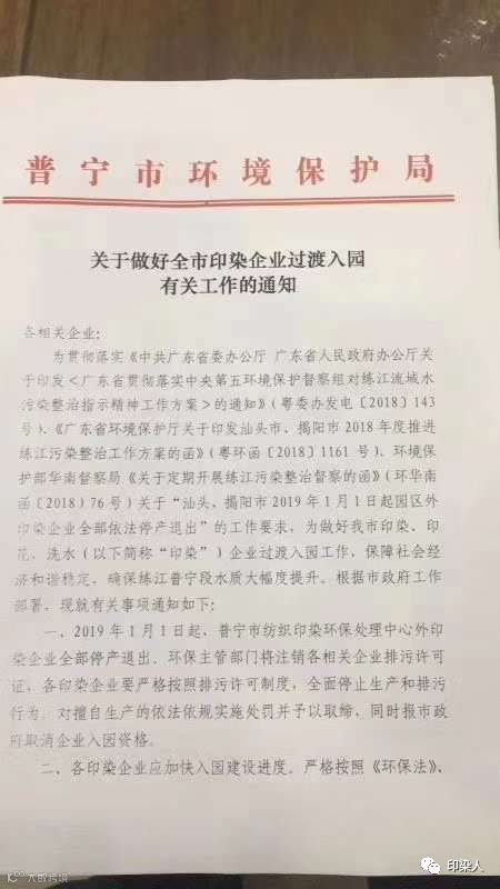 2018年9月中旬,普宁市环保局发出《关于深化全市有牌证印染等重污染行业环境整治工作的通知》。