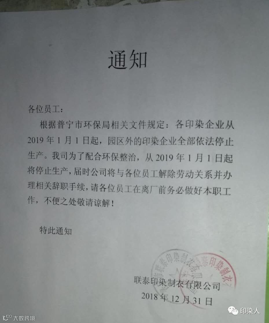 普宁联泰印染制衣是一家老牌印染企业,是一家大型染整印染企业,该公司已经与2018年12月31日发出通知,公司为了配合环保整治,从2019年1月1日起停止生产。