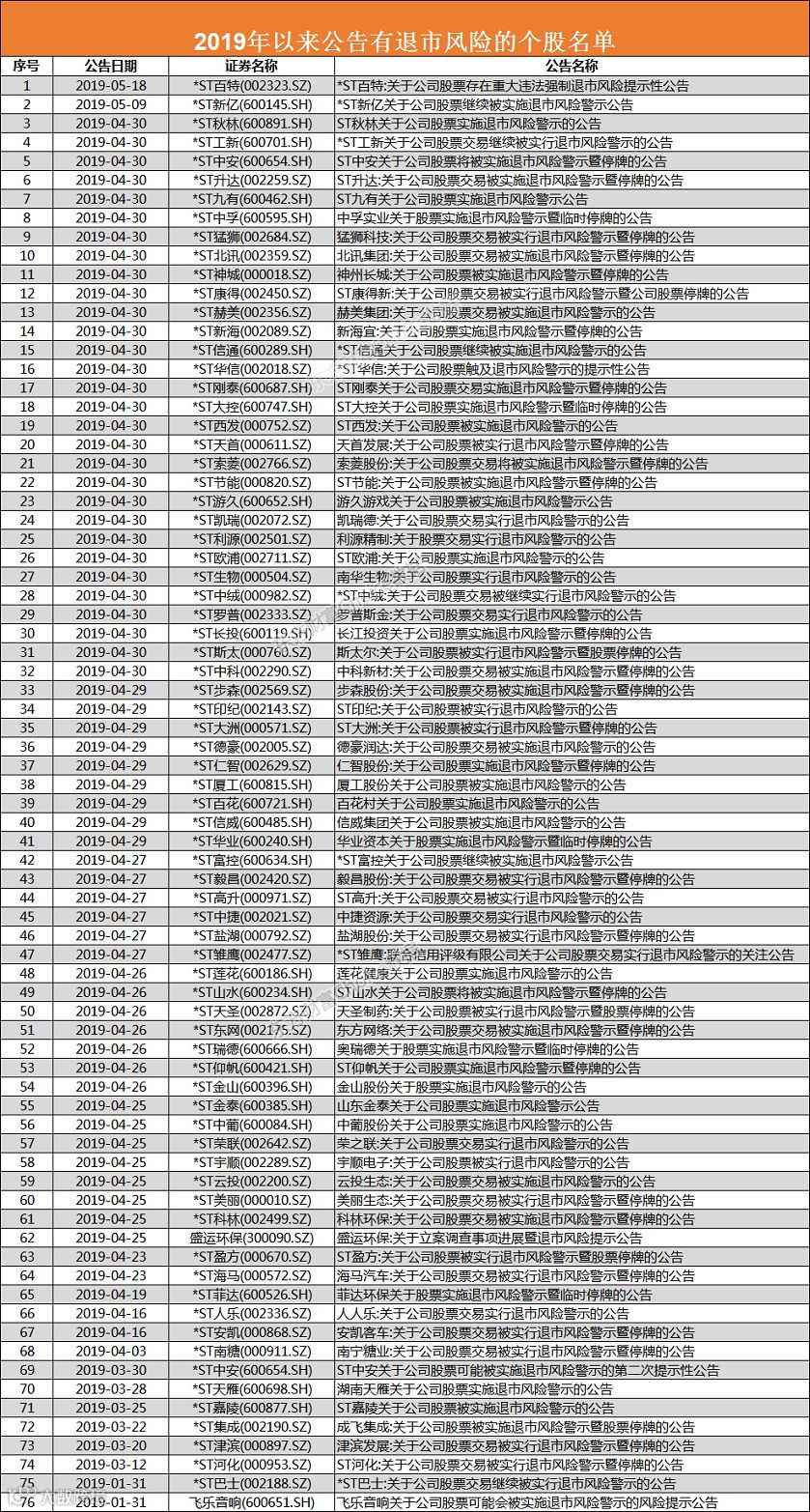 东方财富Choice数据显示,根据公告不完全统计,2019年以来,还有76家上市公司面临退市风险。