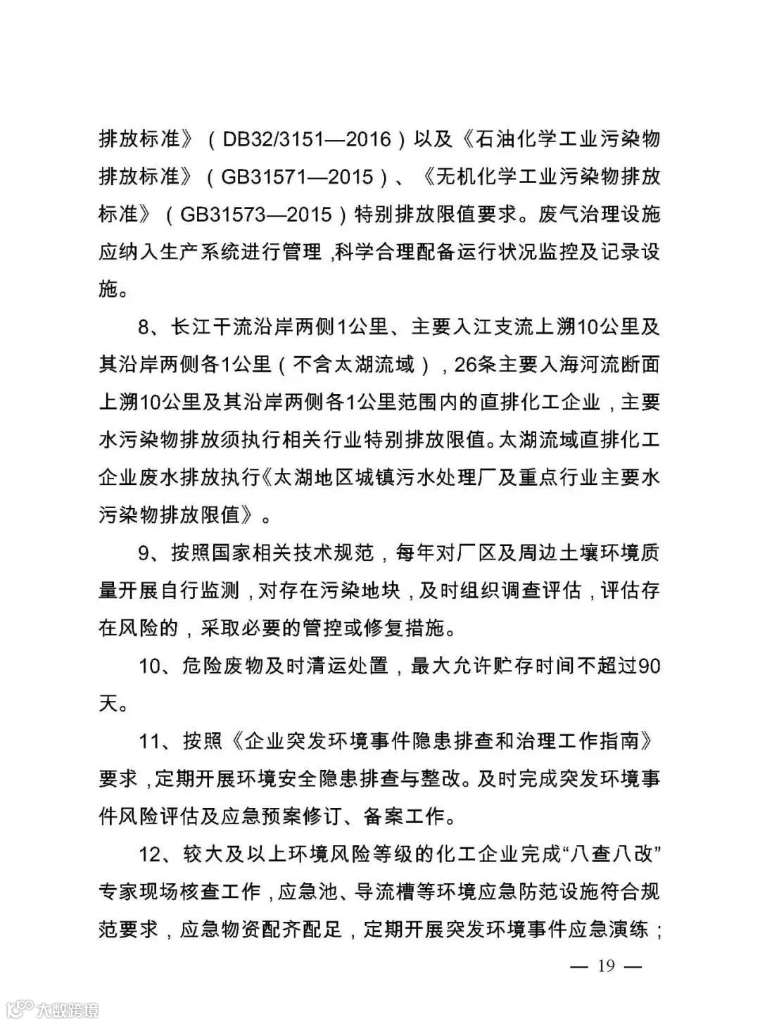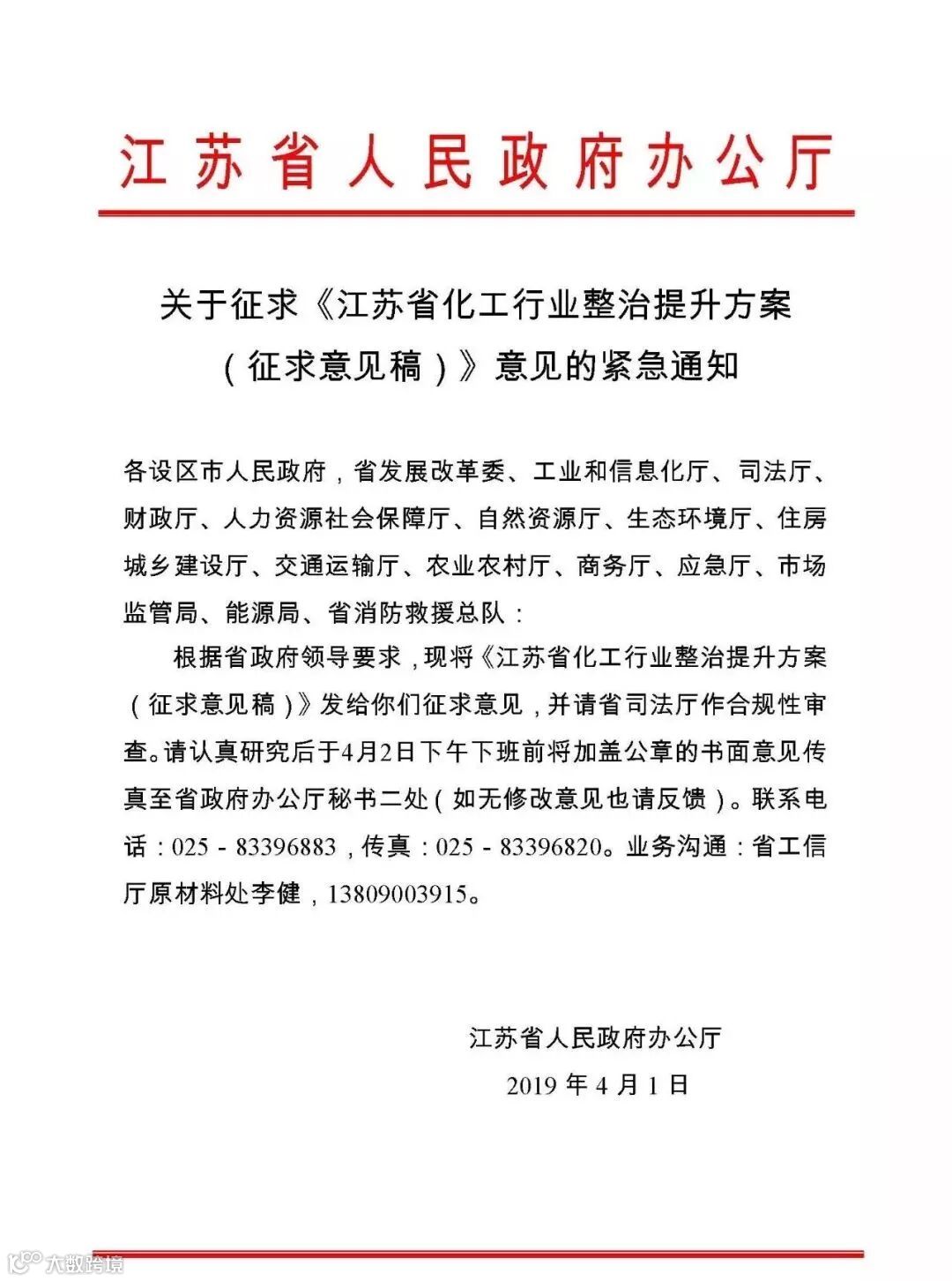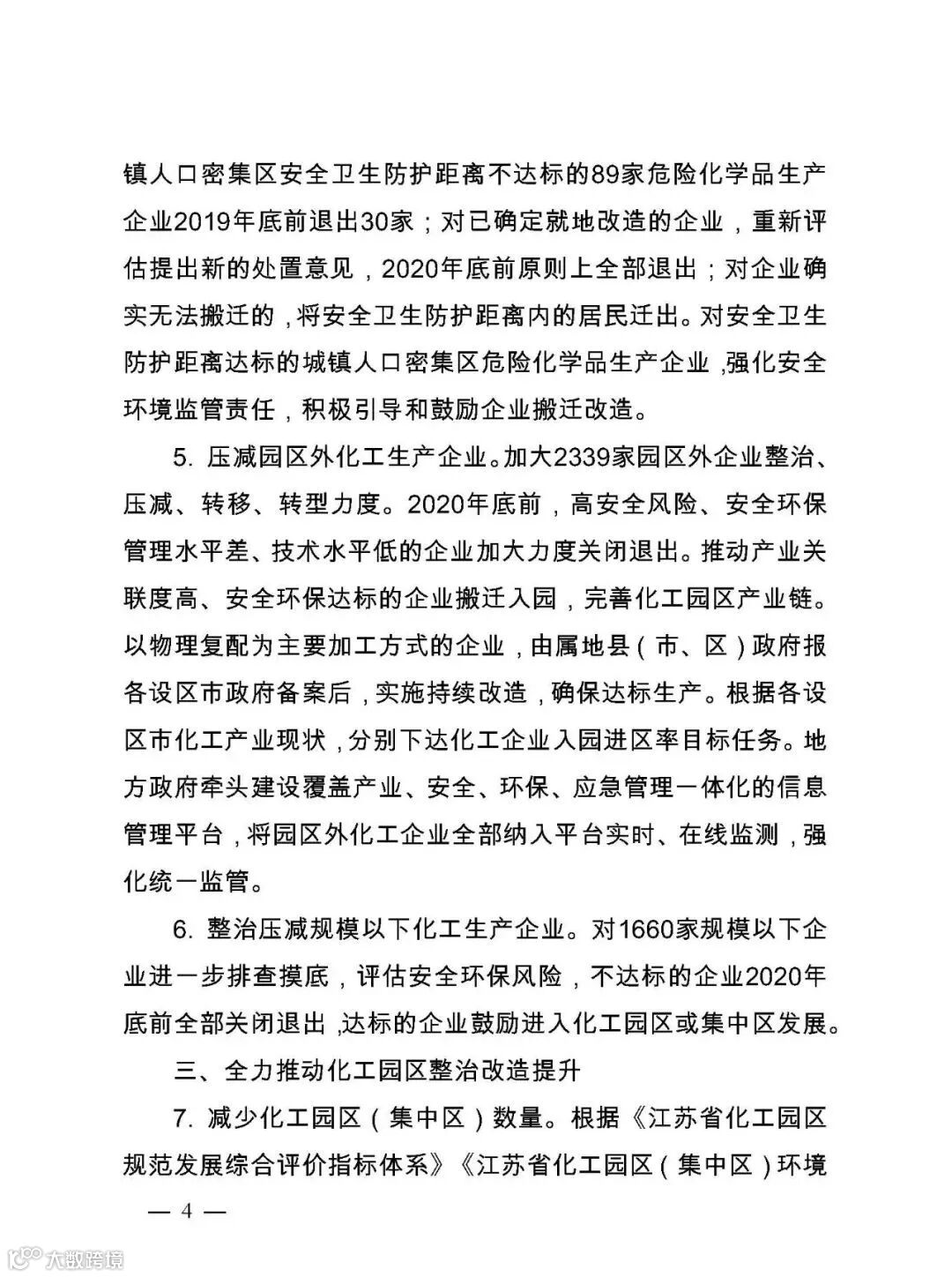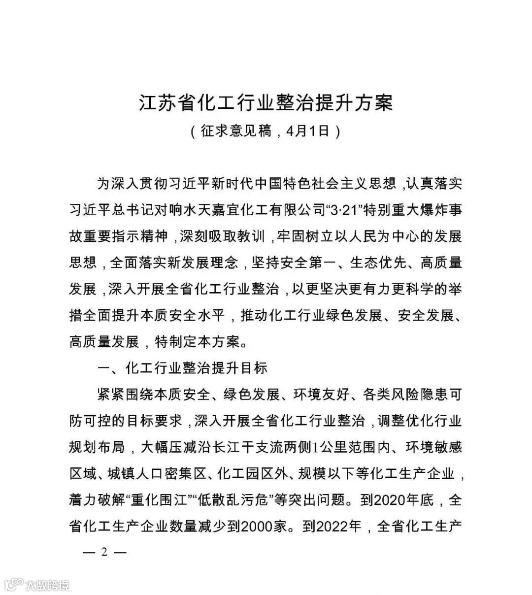 同时,自江苏省“3.21”响水化工厂爆炸事故发生之后,江苏省人民政府办公厅发布了关于征求《江苏省化工行业整治提升方案(征求意见稿)》(以下简称“方案”)意见的紧急通知。对未来五年之内,江苏省化工企业、化工园区的改造升级及退出做出了明确指示。