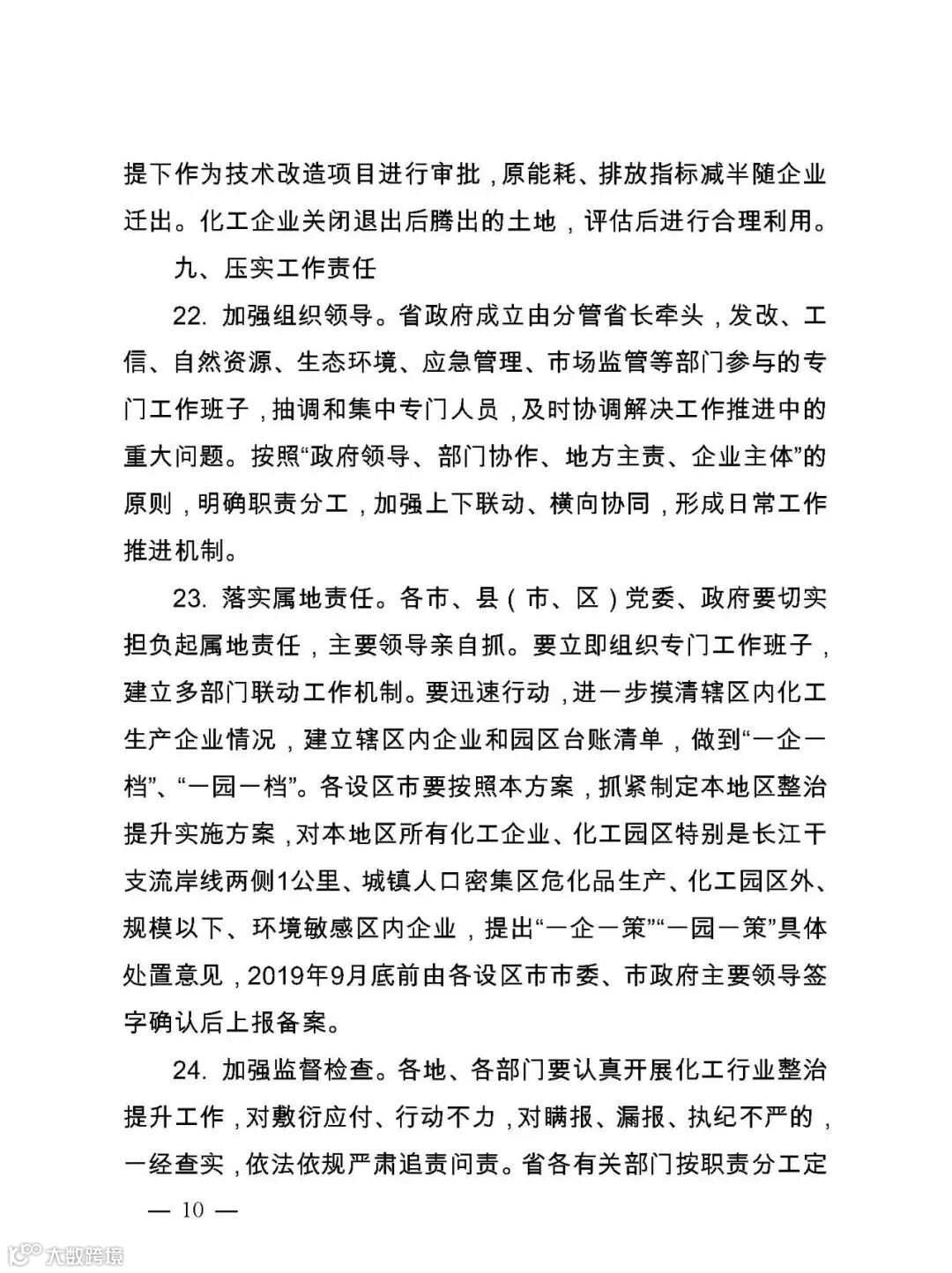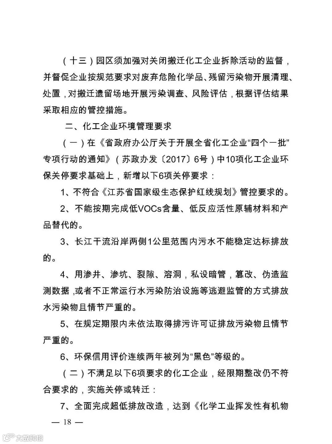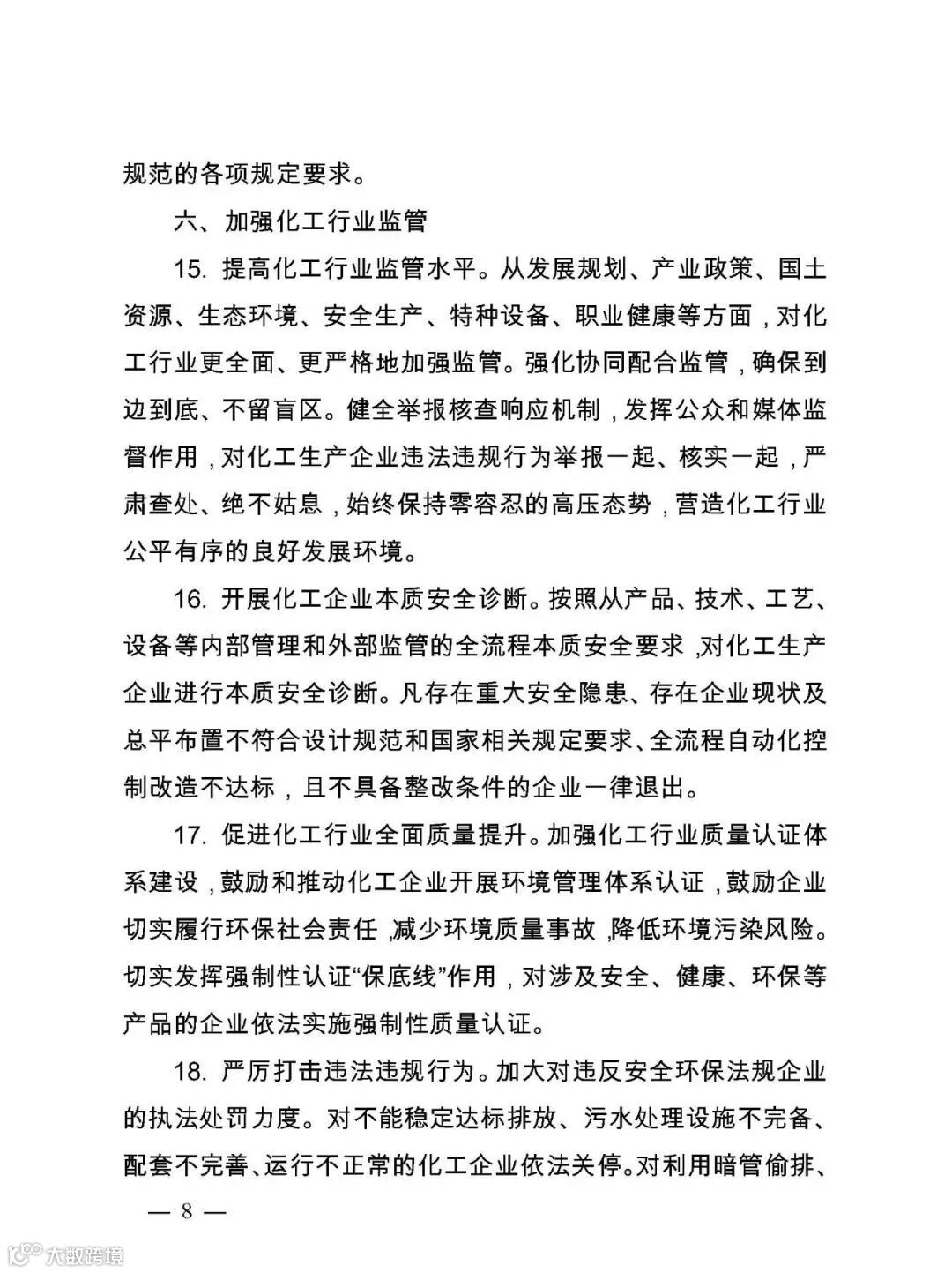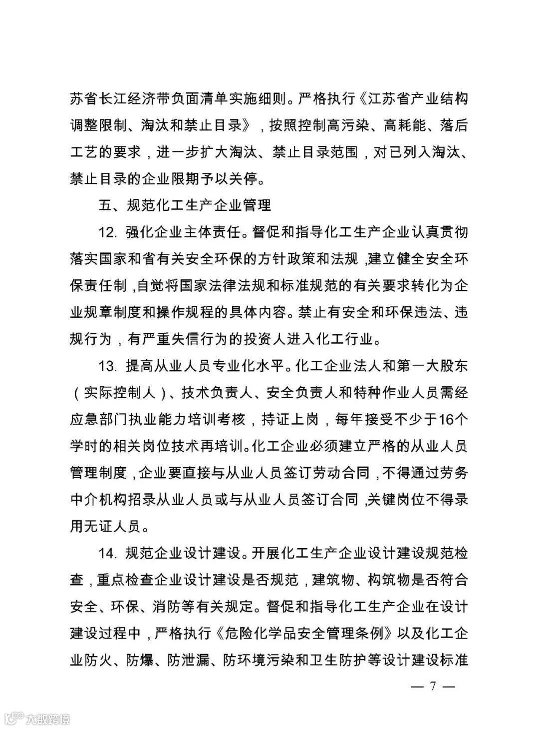 同时,自江苏省“3.21”响水化工厂爆炸事故发生之后,江苏省人民政府办公厅发布了关于征求《江苏省化工行业整治提升方案(征求意见稿)》(以下简称“方案”)意见的紧急通知。对未来五年之内,江苏省化工企业、化工园区的改造升级及退出做出了明确指示。