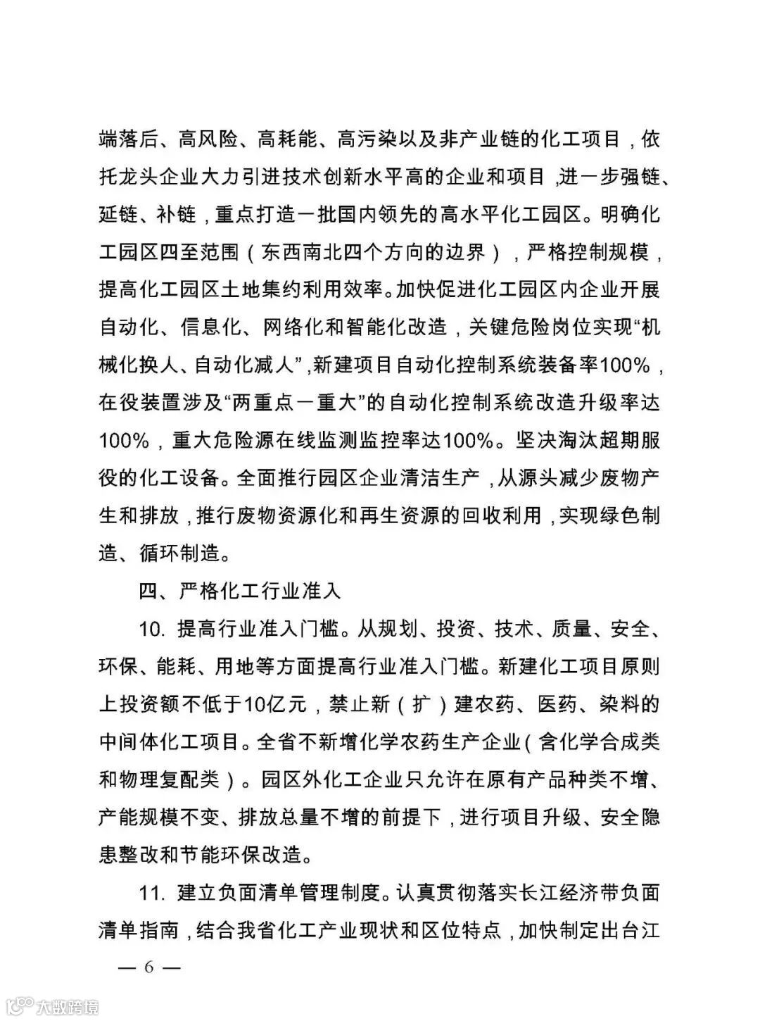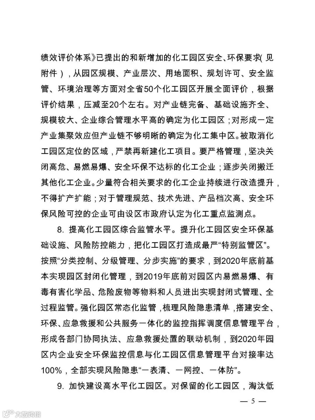 从园区区域、产业层次、用地面积、规划许可、安全监管、环境治理等方面对全省50个化工园区开展全面评价,根据评价结果,压减至20个左右;