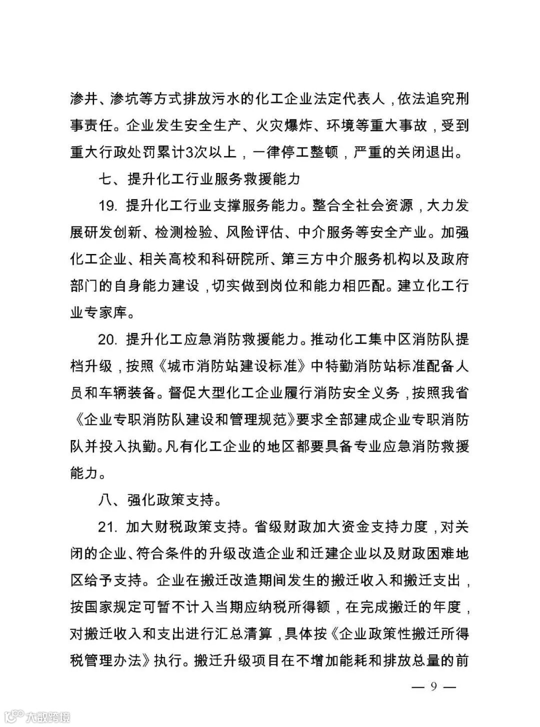 加大2339家园区外企业整治、压减、转移、转型。2020年底前,高安全风险、安全环保管理水平差、技术水平低的企业加大力度关闭退出;