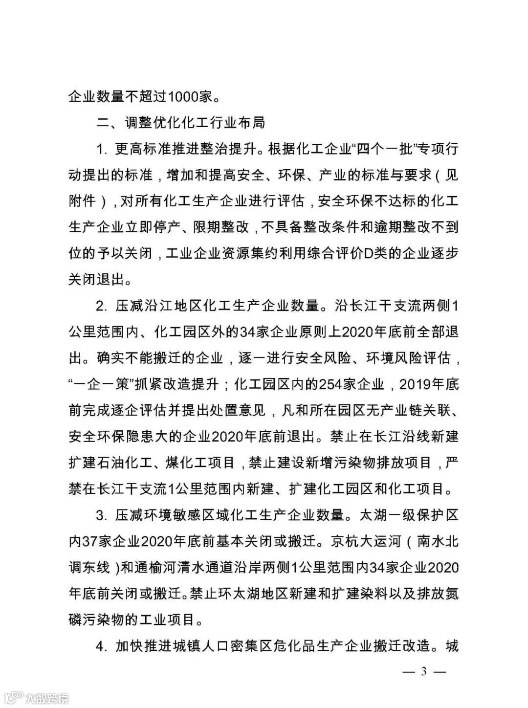 沿长江干支流两侧1公里范围内、化工园区外的34家企业原则上2020年底前全部退出;