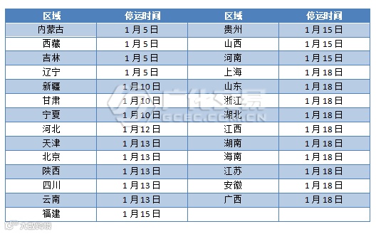 内蒙古,西藏,吉林,辽宁等地1月5日停运,新疆,甘肃,宁夏等地1月10日停运。河北1月12日停运,天津,北京,陕西,四川,云南等地1月13日停运。福建,贵州,山西,河南等地1月15日停运。上海,山东,浙江,湖北,江西,湖南,海南,江苏,安徽,广西等地1月18日停运。