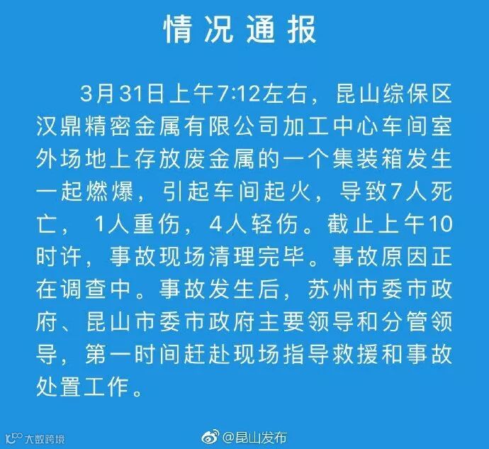昆山发布”微信公众号消息,3月31日上午7:12左右,昆山综保区汉鼎精密金属有限公司加工中心车间室外场地上存放废金属的一个集装箱发生一起燃爆,引起车间起火,导致7人死亡, 1人重伤,4人轻伤。