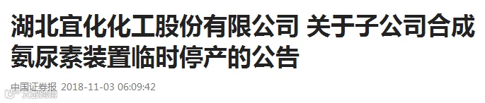 *ST宜化(000422)11月2日晚公告称,公司子公司内蒙古鄂尔多斯联合化工有限公司(简称“联合化工”)通知,因冬季天然气供应受限,联合化工年产 52 万吨合成氨 104 万吨尿素装置于 2018年 11月 1日起停产。