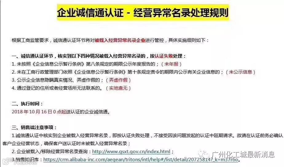 导读:提示:点击↑上方"广州化工城最新消息"关注我! 老板们注意了注意了,执照出现异常情况的,10.16之后诚信通