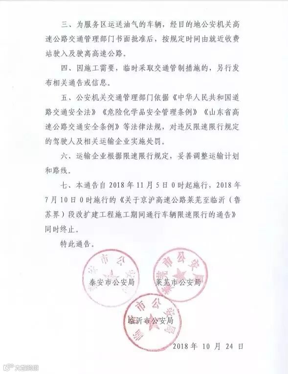 七、本通告自2018年11月5日0时起施行,2018年7月10日0时施行的《关于京沪高速公路莱芜至临沂(鲁苏界)段改扩建工程施工期间通行车辆限速限行的通告》同时终止。