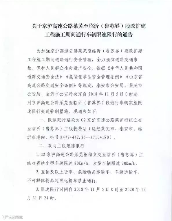 为加强京沪高速公路莱芜至临沂(鲁苏界)段改扩建工程施工期间道路通行安全管理,全力预防道路交通事故,保护人民群众生命财产安全,依据《中华人民共和国道路交通安全法》《危险化学品安全管理条例》《山东省高速公路交通安全条例》等规定,泰安市公安局、莱芜市公安局、临沂市公安局决定自2018年11月5日0时起,对京沪高速公路莱芜至临沂(鲁苏界)段通行车辆实施限速限行交通管制措施。通告如下: