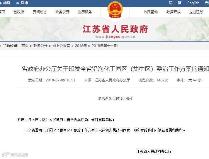江苏:出台《全省沿海化工园区(集中区)整治工作方案》,严格整治沿江化工园。强化化工园的排污生产范围,计划2020将当前化工园中的企业数量减少50%。