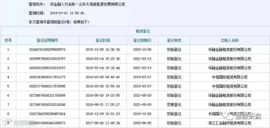大海集团旗下大海新能源在中登网上有多笔租赁业务登记,涉及华融金融租赁股份有限公司、中恒国际租赁有限公司、浙江汇金融资租赁有限公司和长城国兴金融租赁有限公司。