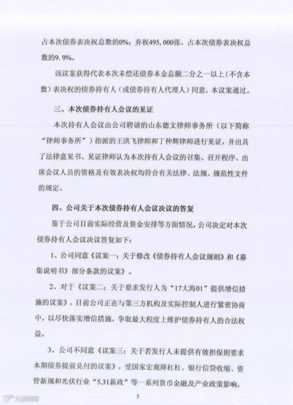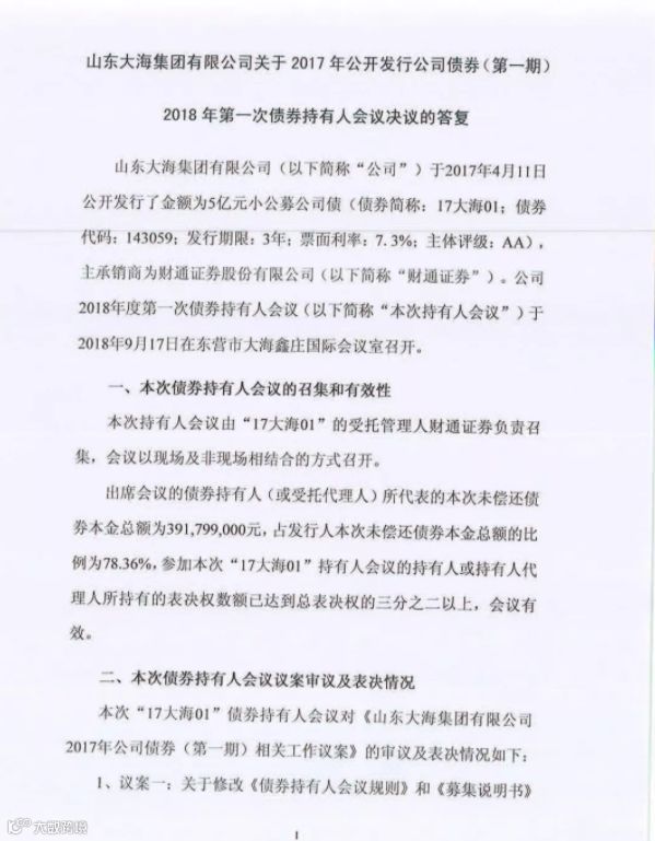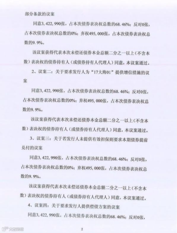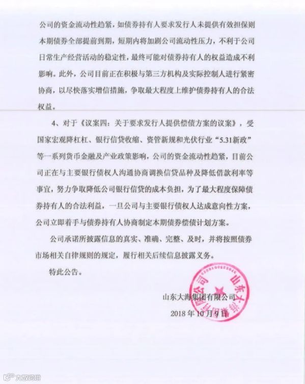 鉴于市场行情以及大海集团的经营情况,2018年9月大海集团债券持有人委员会决议,要求大海集团提供增信措施,对于不能提供增信措施的债券部分要求提前到期兑付,被大海集团拒绝。