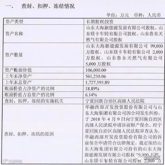 经裁定,大海集团持有的大海新能源股权99,000万股、山东镁卡车轮有限公司股权2,000万股、山东鲁东天然气有限公司股权5,000万股被司法冻结; 被冻结资产账面价值10.60亿元,占2017年末大海集团合并口径净资产18.89%占总资产的6.14%。