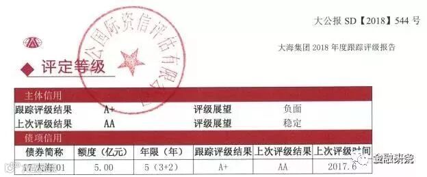 企业评级被大幅下调,不影响评选中国500强吗?2018年6月27日,大公国际下调了山东大海集团有限公司主体评级到A+,从AA评级骤降到A+,展望调整为负面,在近期的债券市场还是比较少见的。