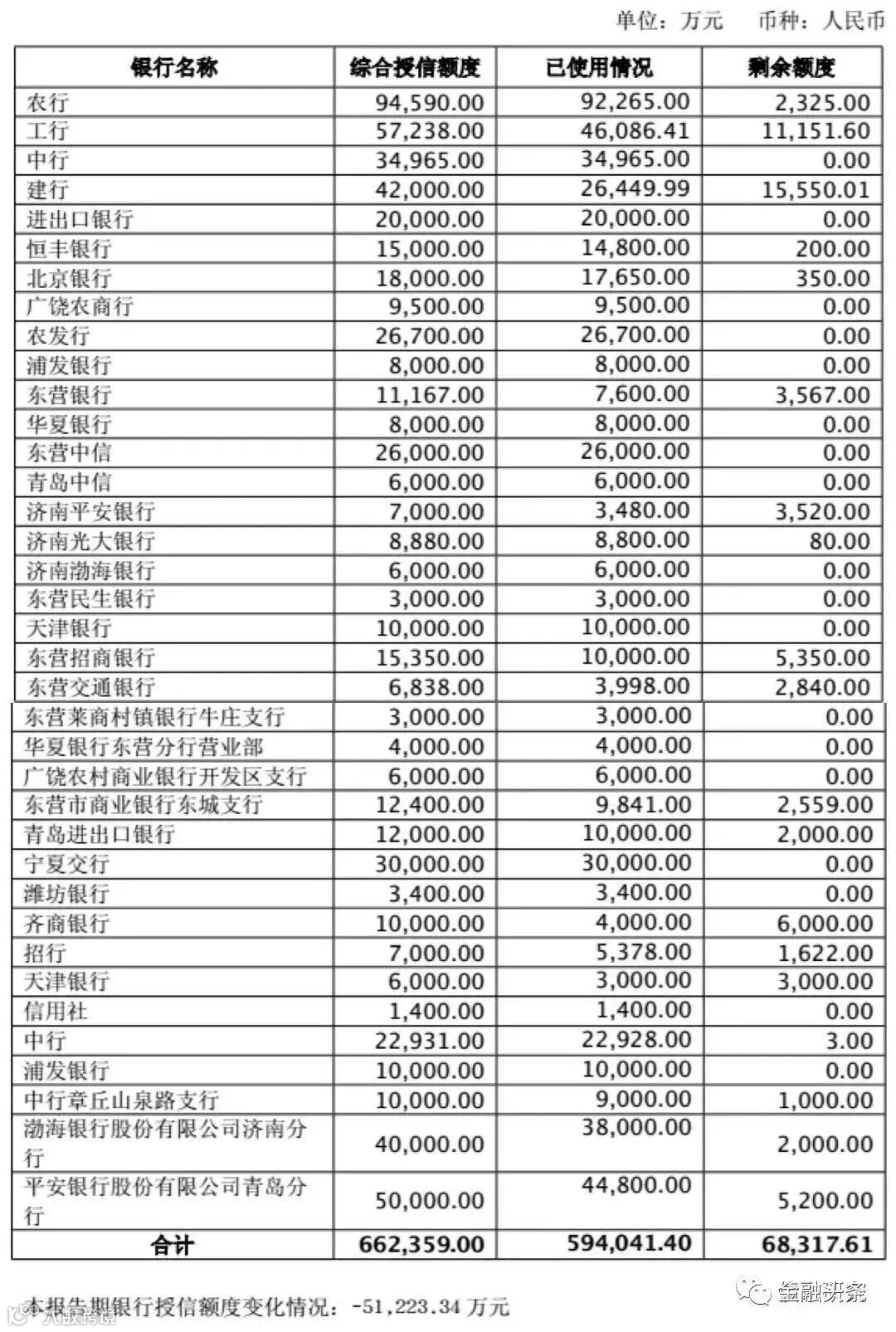 共有37家银行给大海集团提供66.2亿综合授信,已使用59.4亿,几乎没有剩余。按已使用授信规模排名前十的依次是农行9.2亿、工行4.6亿、青岛平安银行4.5亿、济南渤海银行3.8亿、中行3.5亿、宁夏交行3亿、农发行2.7亿、建行2.6亿、中信银行2.6亿、进出口2亿。