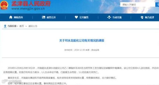 河南省孟津县人民政府网站12月9日消息,孟津县安全生产监督管理局9日下午发布《关于对永龙能化公司有关情况的通报》。通报称,2018年12月8日20时30分许,河南能化孟津永龙能化公司乙二醇备料车间4名当班劳务工发生疑似亚硝酸钠中毒事故。