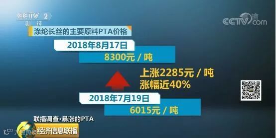 近两月,以PTA为首的原材料价格迎来大涨。PTA这一轮行情从6月20日开始启动,两个月内,PTA1809从5562上涨至8450元,如果当时你花10万买期货的话,时至今日估计已经翻了5倍。“炒房炒股不如炒PTA”已经不是一句笑话。PTA的暴涨人尽皆知,也引起了央视对聚酯产业链的关注!
