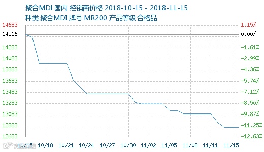 原料MDI方面,据烟台万华近日公告,2018年11月份万华聚合MDI对经销商执行挂牌结算价14200元/吨,环比下调1300元/吨。烟台万华11月纯MDI挂牌桶装价格执行26200元/吨,散水价格执行26000元/吨,环比下调3000元/吨。据悉,宁波万华MDI一期装置(40万吨/年)于2018年11月1日停车,预计检修22天左右;二期装置(80万吨/年)将于2018年12月1日开始停车,预计检修31天左右。此外,亨斯迈11月聚合MDI对分销市场挂牌价格执行14200元/吨,环比下调1300元/吨。亨斯迈11月纯MDI挂牌桶装价格执行26200元/吨,环比下调3000元/吨。上海科思创聚合MDI本周出厂价格执行12900元/吨,较上周下调200元/吨。