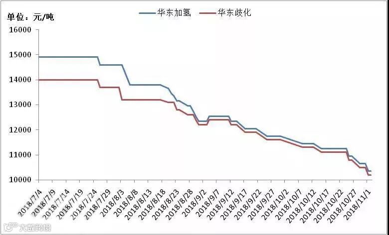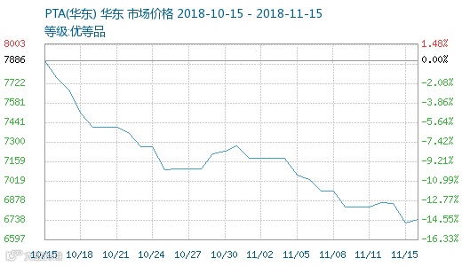 业内人士分析,聚酯树脂此次价格下降主要原因系受到原料PTA价格大幅下跌的影响,截止11月15日,PTA1901主力合约价格从两月前8062元/吨的高点下降到6644元/吨,下降幅度为17.59%。