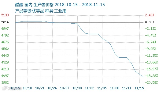 除聚酯产业链整体下跌以外,部分助剂、溶剂原料价格也出现不同幅度的下滑,醋酸市场即将突破全年最低,11月12日河南龙宇与河南顺达醋酸报盘破4执行3900元/吨承兑出厂,距离全年最低点3650元/吨仅差250元/吨,有分析人士认为,照目前日跌100元/吨趋势本周很有可能将突破新的醋酸全年最低点,预计未来短时间内醋酸市场仍会震荡下行。