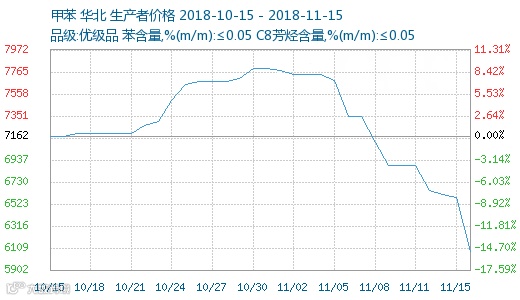 作为化工行业最重要的原料之一,原油的价格涨跌将直接影响化工行业整体的盈利状况。近期,全球三大产油国美国、俄罗斯、沙特的原油产量上升令国际油价承压下行。国际油价进入断崖式下跌,国内油价也随着下跌,油价也进入了便宜时代,油价疯狂上涨,但也疯狂下跌,当地时间11月13日,美原油价格暴跌8%,连续12个交易日下跌,创下三年多来最大单日跌幅。全球原油价格基准布伦特原油期货也重挫6.6%,陷入熊市,报每桶65.47美元,为7月以来最大单日跌幅。紧跟原油步伐,甲苯价格连续暴跌,从10月30日到11月15日,甲苯综合价格从7908.75元/吨下降到6109.38元/吨,下跌1799.37元/吨,跌幅22.75%。