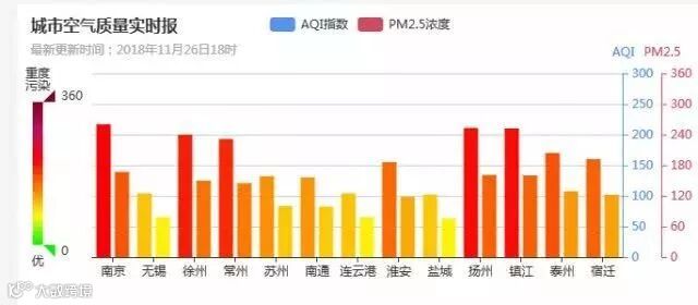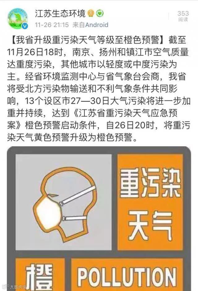 短短三天内,江苏经历了重污染天气蓝色预警、黄色预警和橙色预警的 " 三级跳 "。11 月 26 日晚间,江苏省生态环境厅官方微博发布,江苏再次将重污染天气升级为橙色预警。