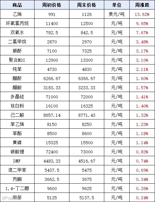 环氧氯丙烷:本周华东地区环氧氯丙烷的价格为12500元/吨,周涨幅为10.62%。10天上涨1700元/吨,节后归来,由于主力生产厂家装置停车,厂家库存较少,场内新单主动报盘探涨。尽管大多下游环氧树脂买盘尚未返市,但非树脂行业下游工厂积极入市补货,刚需小单推动市场报盘持续上行。