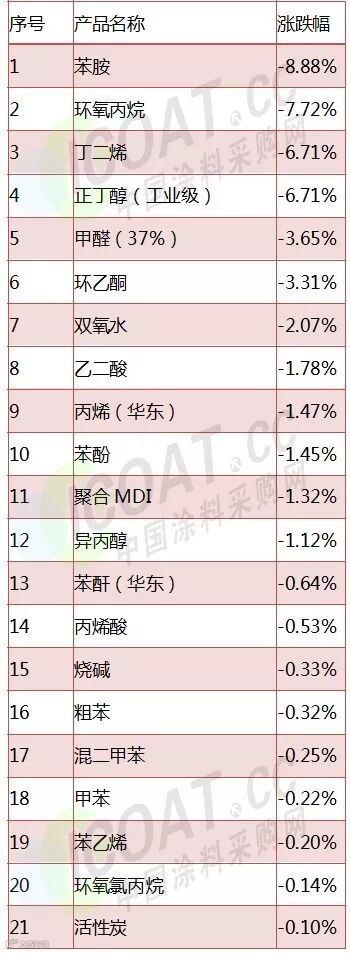 原油作为一项重要的化工材料,它的暴跌直接造成化工行业众多重要化工品的价格下跌!据涂料采购网了解,上周环比下降的榜单上周环比下降的商品共有34种,占大宗榜的47.22%,跌幅三巨头分别是:盐酸(-11.81%)、苯胺(-8.88%)、环氧丙烷(-7.72%)。
