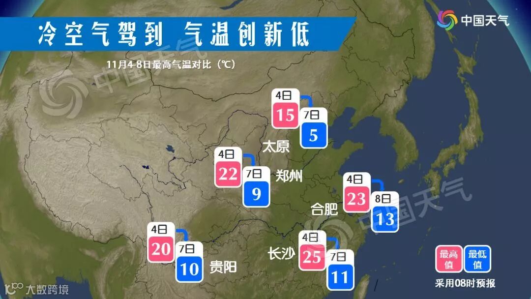 比如长沙最高温将从25℃降到11℃