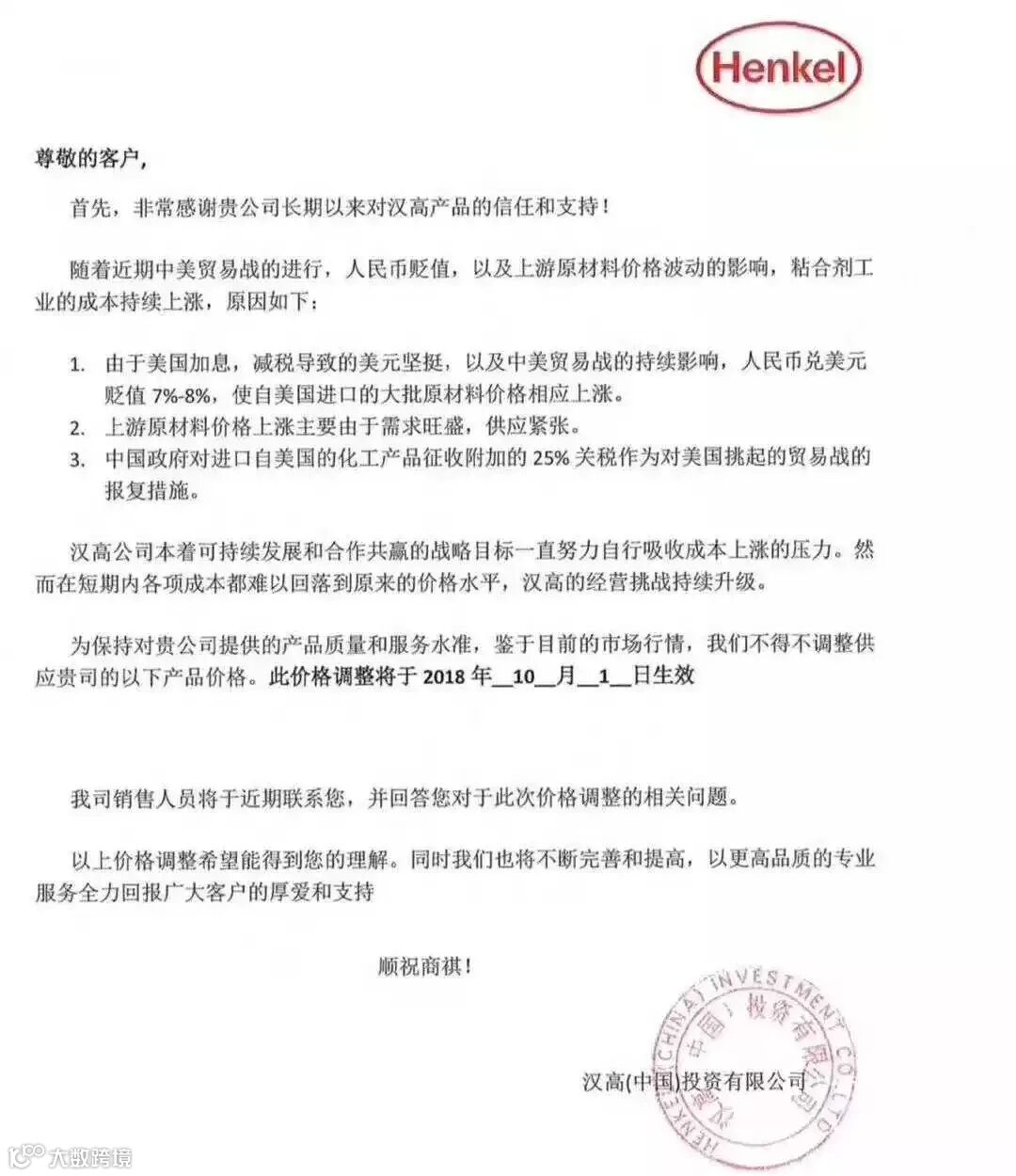 国际胶粘剂巨头汉高发布涨价函称,由于美国加息,导致美元坚挺,人民币贬值,以及中美互加贸易关税,使自美国进口的大批原材料供应价格走高;同时,市场供货紧张,更加剧了原材料价格上涨。成本压力之下,汉高将从10月1日起上调粘合剂产品价格。