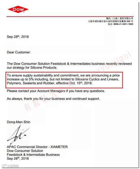 昨天,陶氏化学发布通知称,为保证产品持续供应和对客户的承诺,陶氏宣布上调产品价格,包括但不限于硅氧烷、聚合物、密封胶、橡胶等,价格上调幅度为5%,生效日期为10月15日。