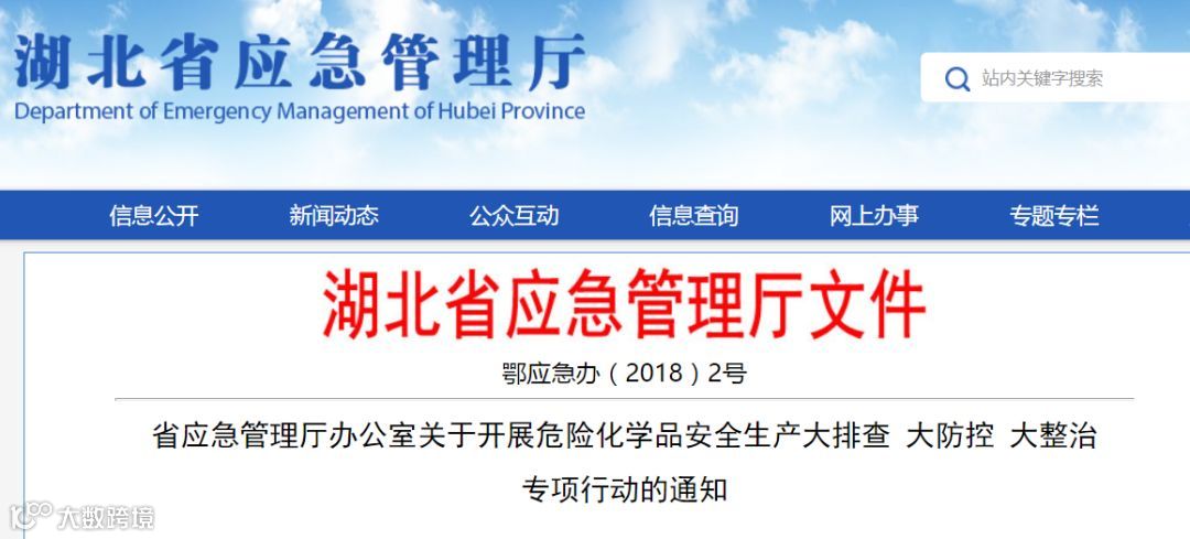 为深入贯彻落实全国、全省危化品安全生产专项视频会议精神、省委省政府领导的指示批示精神和《湖北省安全生产委员会关于认真吸取河北省张家口市“11·28”爆燃事故教训 切实做好开展危险品安全生产工作的紧急通知》(鄂安〔2018〕24号)文件要求,切实吸取事故教训,坚决遏制类似事故发生,省应急管理厅决定,从即日起开展全省危险化学品领域安全生产大排查、大防控、大整治专项行动。现就有关事项通知如下: