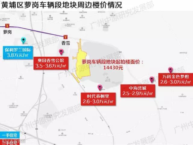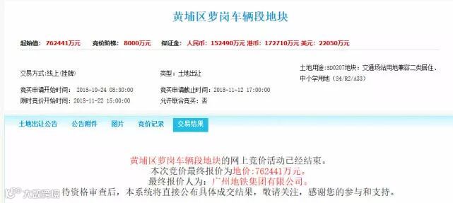 其中萝岗车辆段地块为2018年以来单宗起拍总价最高的地块,被广州地铁集团以底价762441万元,折合楼面价 14430元/㎡拿下。