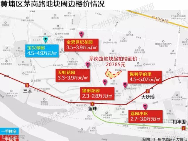 目前,地块周边在售一手楼盘稀缺,位于天河边界的宝兴翠园尾盘在售,均价4.5-4.9万/㎡。地块周边“次新房”二手楼盘保利学府里均价4.5-5.0万/㎡,周边楼龄十年以上的小区房如金碧世纪花园等均价在2.3-3.9万元/㎡不等。