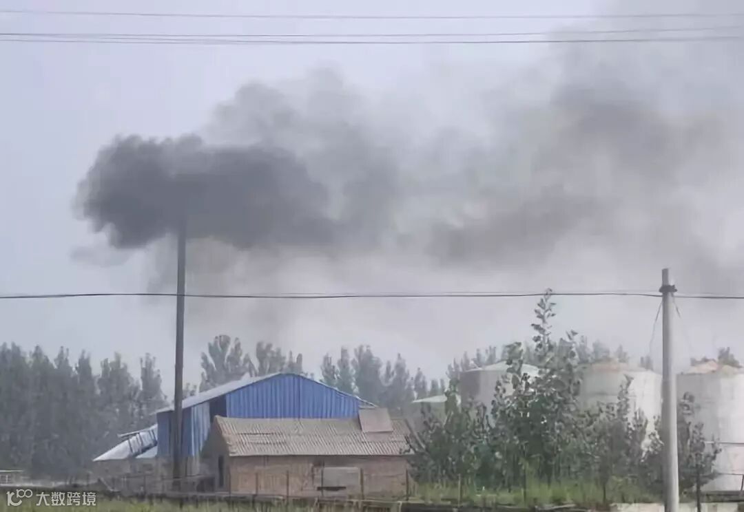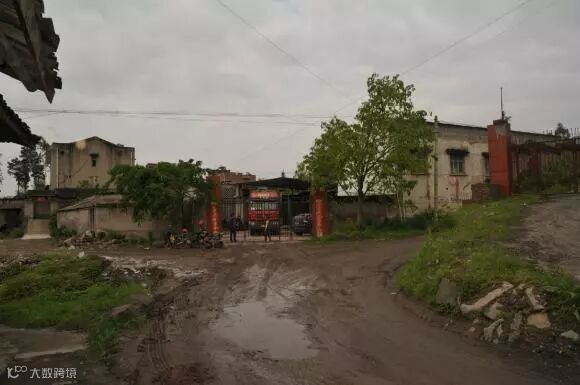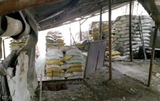 右侧则有大量农用氯化铵及袋装石灰, 3个废水储存池装满了暗红色生产废水。