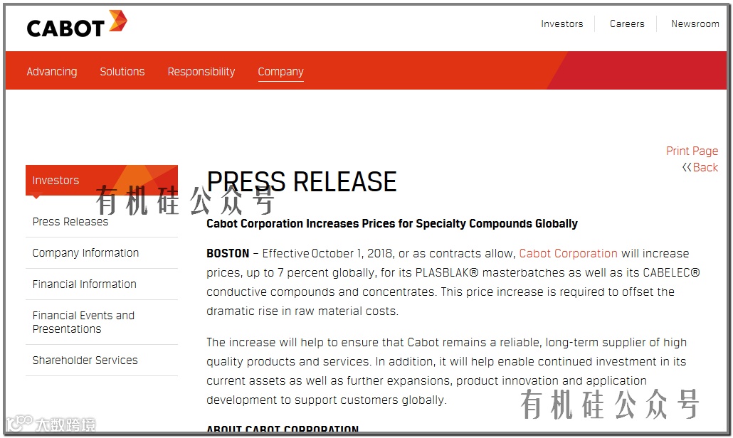 全球炭黑巨头-卡博特近日也发布公告,在全球范围内上调其PLASBLAK®系列母料和CABELEC®导电化合物和浓缩物价格,上调幅度最高可达7%。