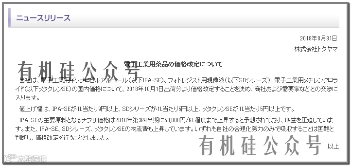 8月31日,日本化工巨头德山化工宣布电子工业用异丙醇、光致抗蚀剂、电子工业用氯甲烷涨价,三种产品每升价格分别上涨9日元、5日元、5日元。