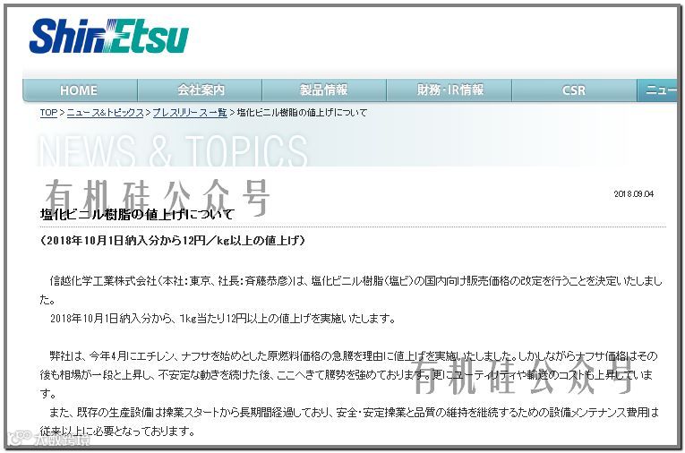 今天,信越发布公告称,从10月1日起,上调氯乙烯树脂(PVC)产品价格,每公斤上涨12日元。信越化学表示,产品价格的上调主要由于原材料价格的上涨以及运输成本的增加。同时,由于中国环保力度不断加大,导致世界市场PVC供应减少,也在一定程度上推高了产品价格。
