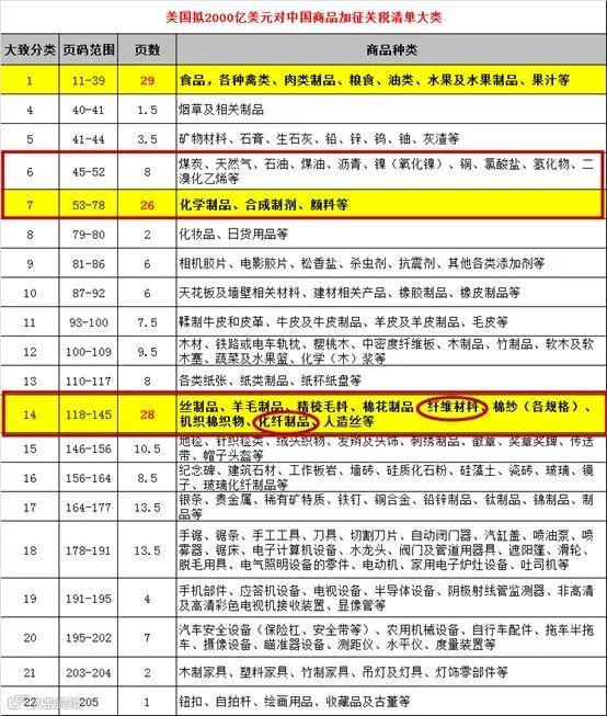 美国加征2000亿关税清单主要大类如下图: