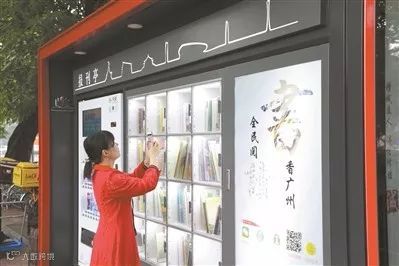 书柜旁印有“书香广州·全民阅读”的公益标语