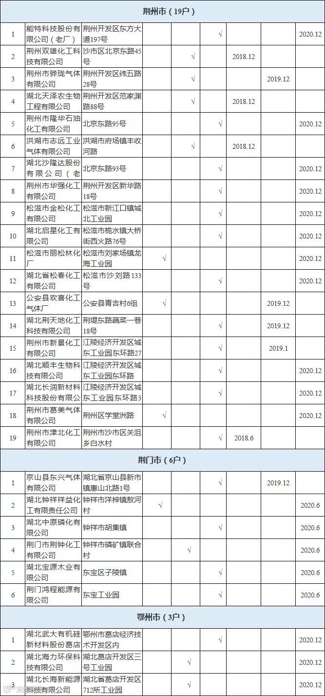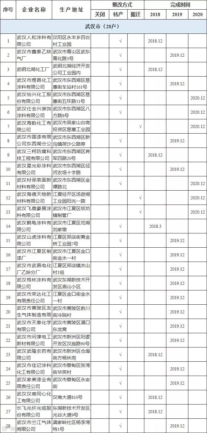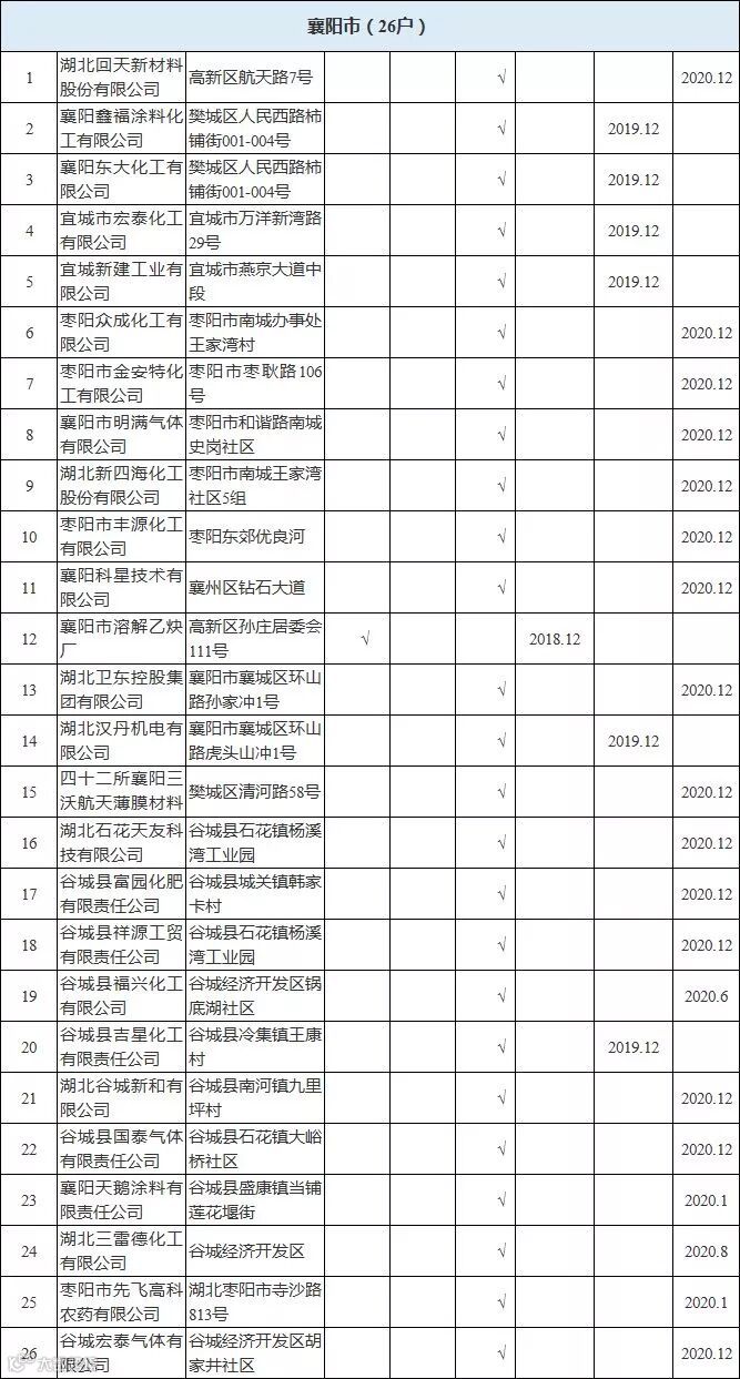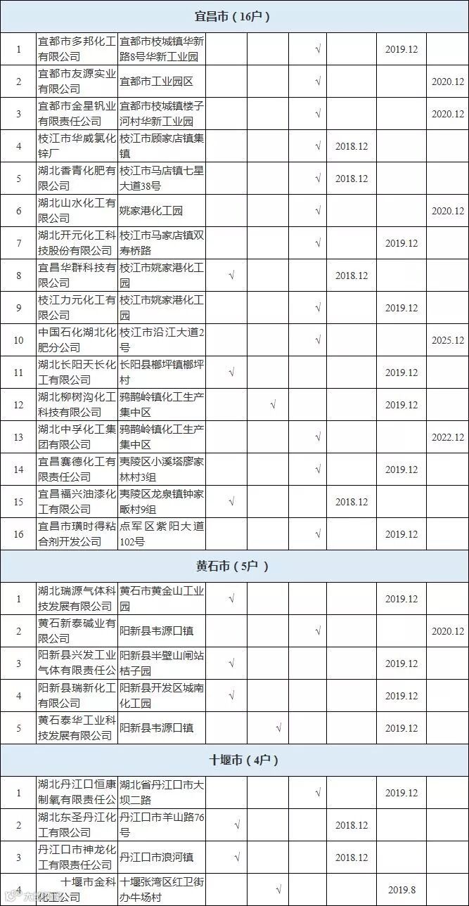 根据清单,湖北省将关闭22户、转产48户、搬迁79户危险化学品企业。在2018年12月底前完成的有34户,2019年12月底前完成的达50户,除湖北中孚化工集团有限公司、中国石化湖北化肥分公司分别在2022年、2025年12月底完成外,其他63户企业必须在2020年12月底前完成搬迁改造任务。