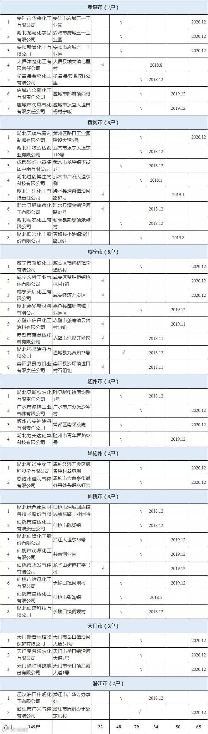根据公示,共有149户危险化学品生产企业进入搬迁改造任务清单。其中,武汉市28户,位居湖北省第一;襄阳市有26户;荆州市19户;宜昌市16户;黄冈市8户;咸宁市8户;仙桃市8户;孝感市7户;荆门市6户;黄石市5户;随州市4户;十堰市4户;鄂州市3户;天门市3户;恩施州2户;潜江市2户。