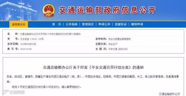 近日,交通运输部办公厅发布了《平安交通百日行动方案》,方案决定自2018年8月6日至11月15日开展“平安交通百日行动”。方案要求,突出安全风险管控的重点,其中涉及危险货物运输。方案提出开展重点领域专项治理。包括以超速、疲劳驾驶为重点开展道路运输整治专项治理;以超限超载、干线公路灾害为重点,开展公路运营专项治理;以整治港口危险货物储存作业为重点开展港口生产安全专项治理。