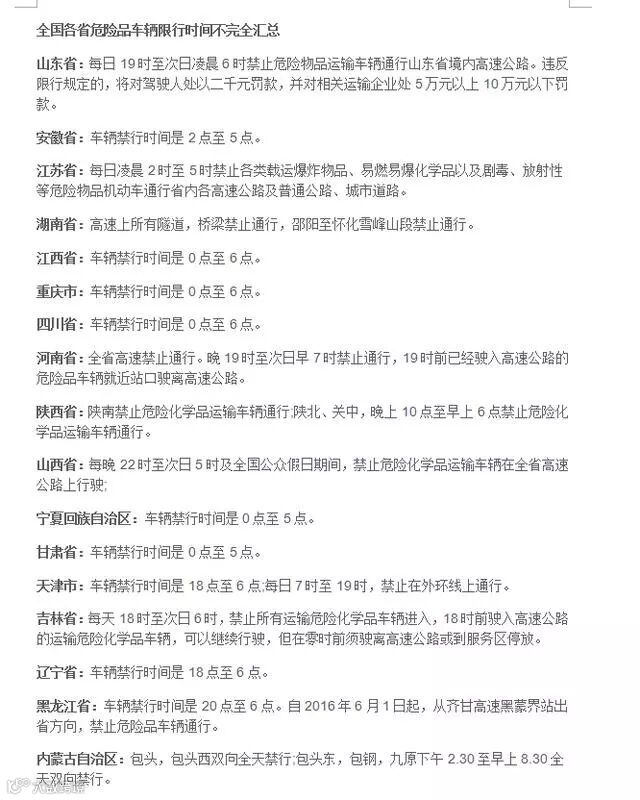 全国各省危险品车辆限行时间不完全汇总(见下图)
