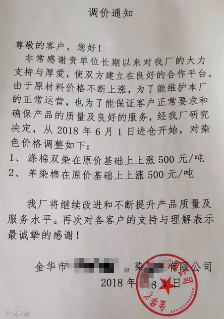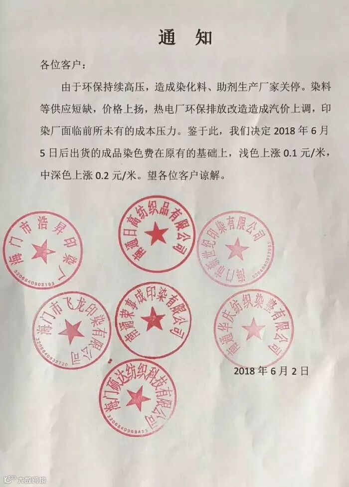 6月2日,南通市七家印染企业联手发布涨价通知,表示由于环保持续高压,染料等供应短缺,价格上扬,热电厂环保改造造成汽价上调,印染厂面临前所未有的成本压力,所以决定6月5日后出货的成本染色费在原有基础上,浅色上涨0.1元/米,中深色上涨0.2元/米。