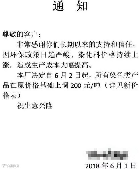 浙江不少印染厂接连发出调价通知,普遍表示涨价原因是环保政策日趋严峻,原材料价格不断上涨。