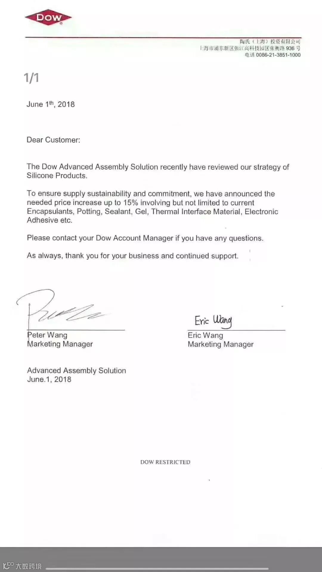 世界有机硅巨头陶氏化学6月1日宣布,为保证产品的正常供应,将提高多类有机硅产品的价格,包括但不限于:有机硅密封胶、灌封胶、硅凝胶、热界面材料、电子胶粘剂等,涨价幅度最高可达15%。