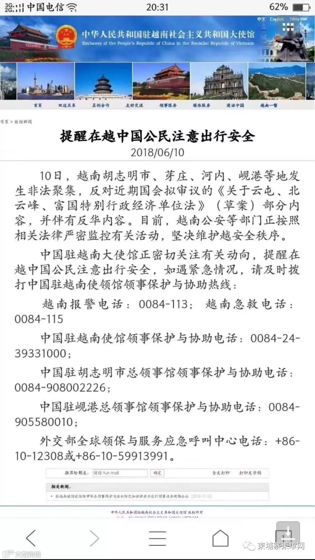 反华示威活动爆发之后,中国驻越南大使馆第一时间发布了提醒,提醒在越的中国公民出行注意安全,并公布了中国驻越南使领馆领事保护与协助热线。
